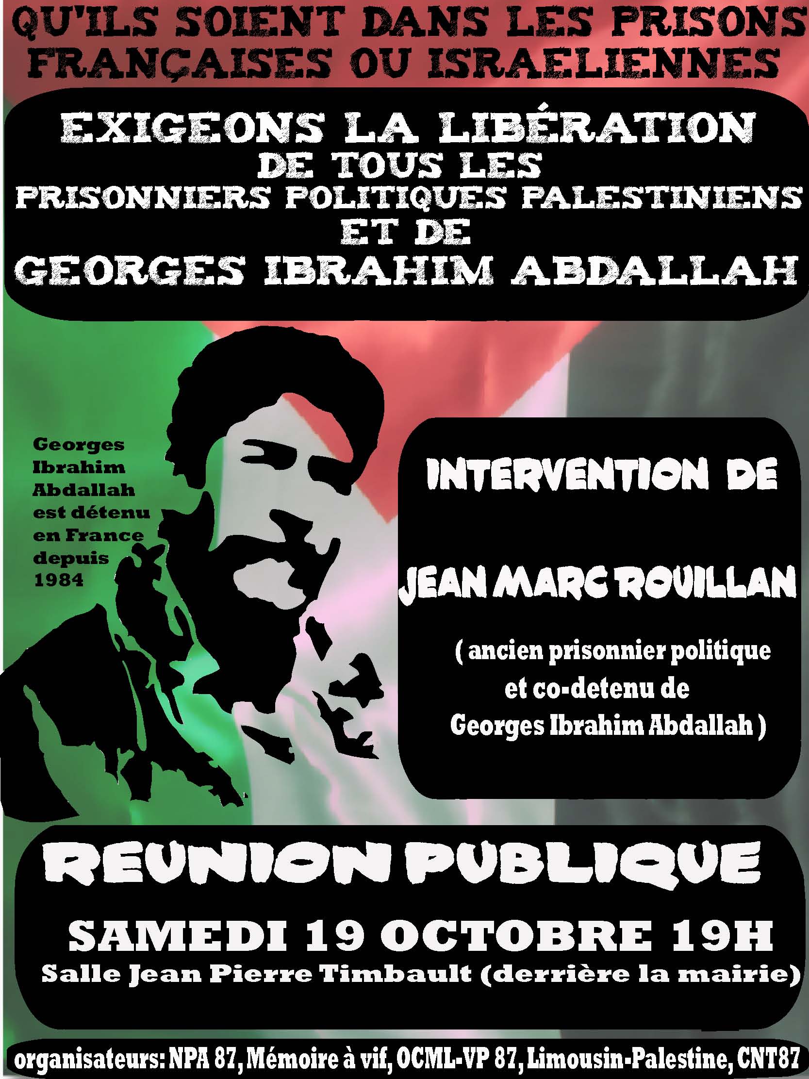 A Limoges également, cette dynamique de solidarité s’exprime par l’oganisation d’une réunion publique, le samedi 19 octobre à partir de 19h, salle Jean-Pierre Timbaud. Cette réunion donnera la parole à Jean-Marc Rouillan, qui a été son codétenu pendant neuf ans et qui vient de participer à la rédaction d’un ouvrage sur le combat et sur la vie de Georges Adballah.