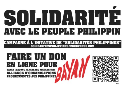 Mais nous ne pouvons pas laisser notre émotion manipulée par ceux qui font main basse sur le pays et se disputent pour faire triompher leurs intérêts dans la région. Le peuple a besoin de secours immédiats. Seuls d’autres exploités peuvent apporter cette aide, parce que nous avons les mêmes intérêts, les mêmes ennemis. Il y a des blessés à soigner, il y a des maisons à reconstruire, il y a aussi des organisations de lutte à soutenir. Nous lançons ici cet appel pour que des fonds soient envoyés aux organisations progressistes qui sont le mieux à même d’aider les populations concernées. Les fonds recueillis seront versés à BAYAN (Bagong Alyansang Makabayan) qui est une alliance de nombreuses organisations progressistes aux Philippines, regroupant de nombreux secteurs (paysan-ne-s, habitant-e-s des bidonvilles, femmes, etc.).