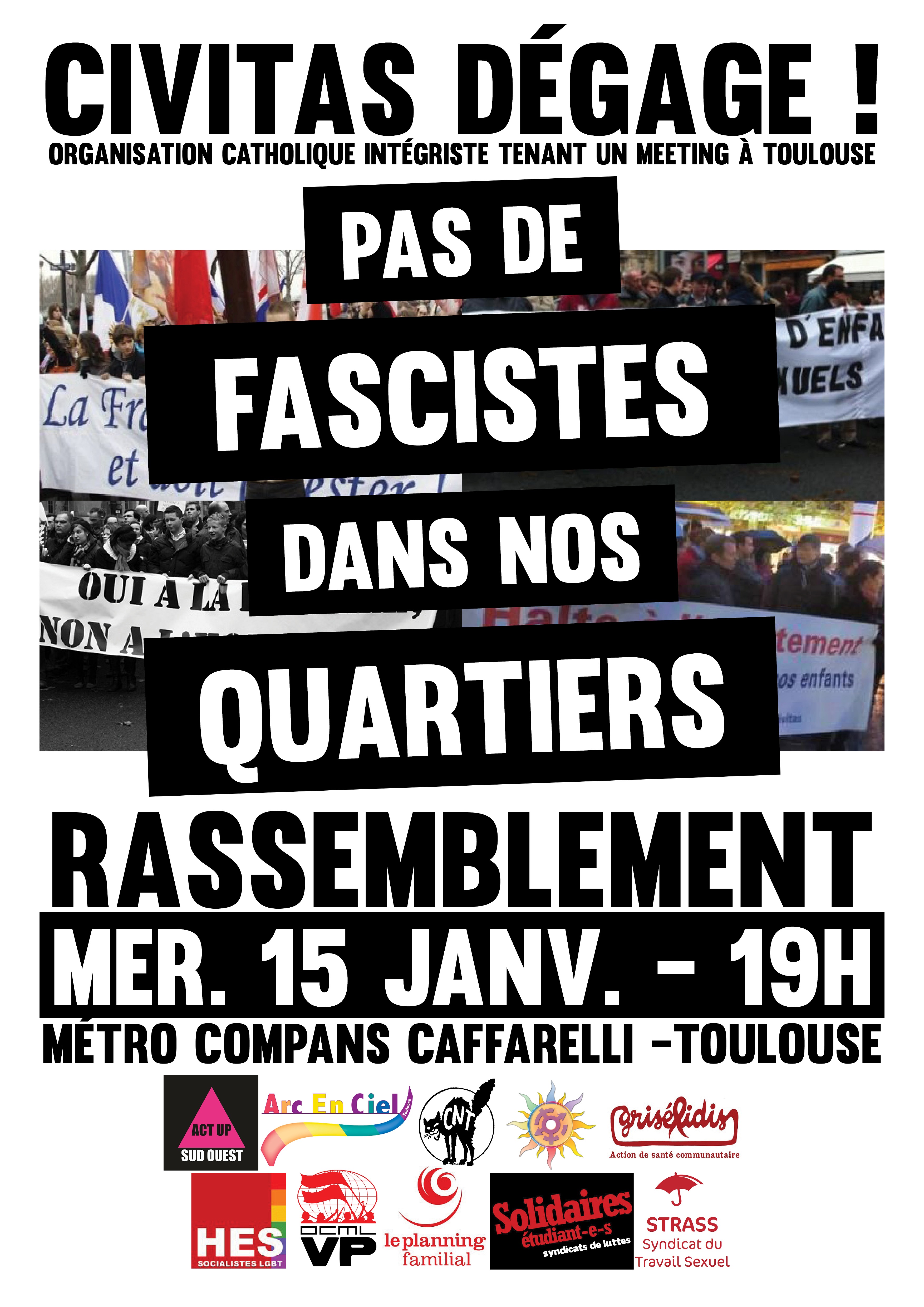 Nous organisations et individuEs de Toulouse appelons à se rassembler le mercredi 15 janvier à 19h Métro Compans Caffarelli pour dénoncer avec force la tenue de ce meeting LGBTIphobe, sexiste et xénophobe dans une salle municipale et les idées réactionnaires qu’il véhicule !