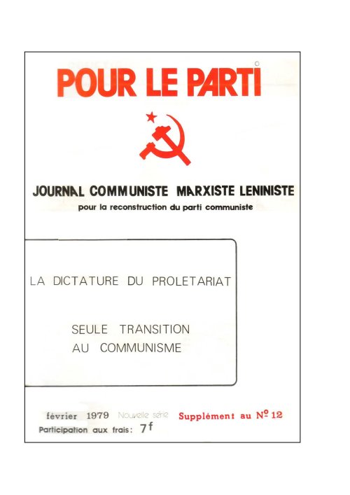 Par la suite, nous poursuivrons la publication d’études sur des problèmes plus particuliers de la lutte des classes sous le socialisme, afin d’analyser le plus précisément possible (et en fonction des informations limitées dont nous disposons) quelles sont les erreurs commises par la dictature du prolétariat qui favorisent la prise du pouvoir par la nouvelle bourgeoisie, ainsi que les succès remportés par le socialisme depuis plus d’un siècle. Ceci non pour faire œuvre d’historien, mais en fonction de la lutte que nous menons pour que la classe ouvrière de France fusionne avec le marxisme-léninisme et se fixe pour but d’instaurer le socialisme. Nous n’avons pas pour tâche d’écrire l’histoire de la Chine ou de 1’U.R.S.S. (qu’écriront les communistes de ces pays), mais de fixer au prolétariat de France le programme du socialisme qui convient à notre situation spécifique en nous appuyant sur ce qu’il y a d’universel dans les expériences qui nous ont précédés et que résume la théorie marxiste-léniniste sur la dictature du prolétariat.