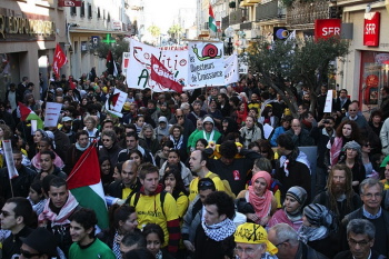 Après les interventions d’un paysan palestinien, d’un cinéaste israélien ou encore de Nicolas Duntze de la Confédération paysanne, un cortège s’est formé pour défiler jusqu’à l’entrée de la gare maritime, en passant devant la mairie, par le quai Lemaresquier et la rue Euzet. Le port, dont l’accès était barré, était placé sous haute surveillance, entre les gendarmes mobiles et maritimes, les policiers et même un hélicoptère. La manifestation s’est dispersée sans incident.