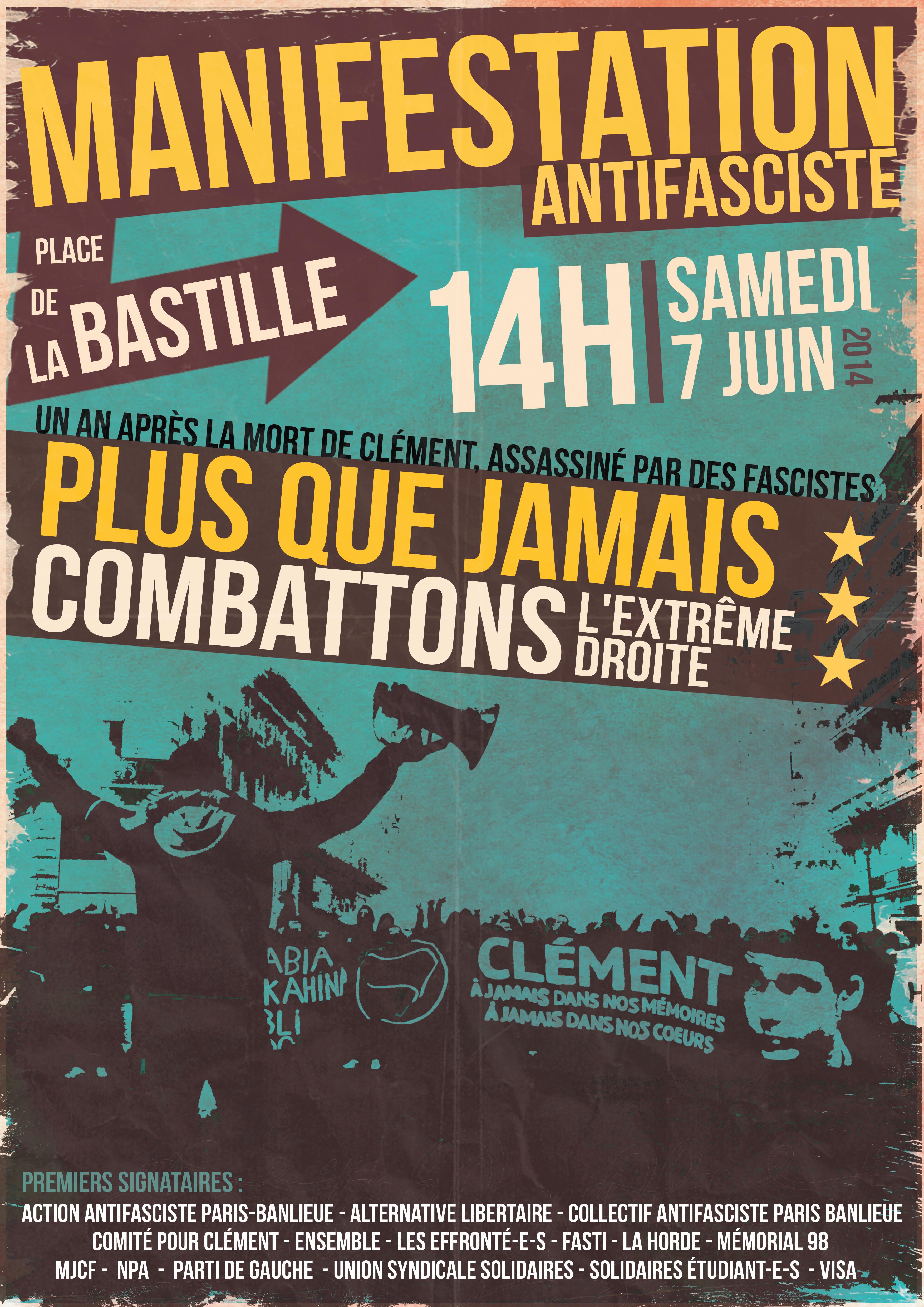 Nous appelons donc à continuer la lutte, en mémoire de Clément et pour toutes les victimes du fascisme, des racismes, du sexisme, de l’homophobie, en participant à la manifestation qui se tiendra un an après sa mort le 7 juin 2014.
