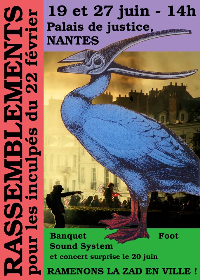 Ce 19 juin, à 18h, nous nous rassemblons devant le Tribunal noir de Nantes pour manifester notre solidarité avec les inculpé-e-s de la lutte contre l’aéroport et son monde : Enguerrand et deux autres manifestant-e-s du 22 février qui sont jugés ce jour-là. Une bouffe végane sera organisée en soutien à tou-te-s les réprimé-e-s et les révolté-e-s du 22 février.