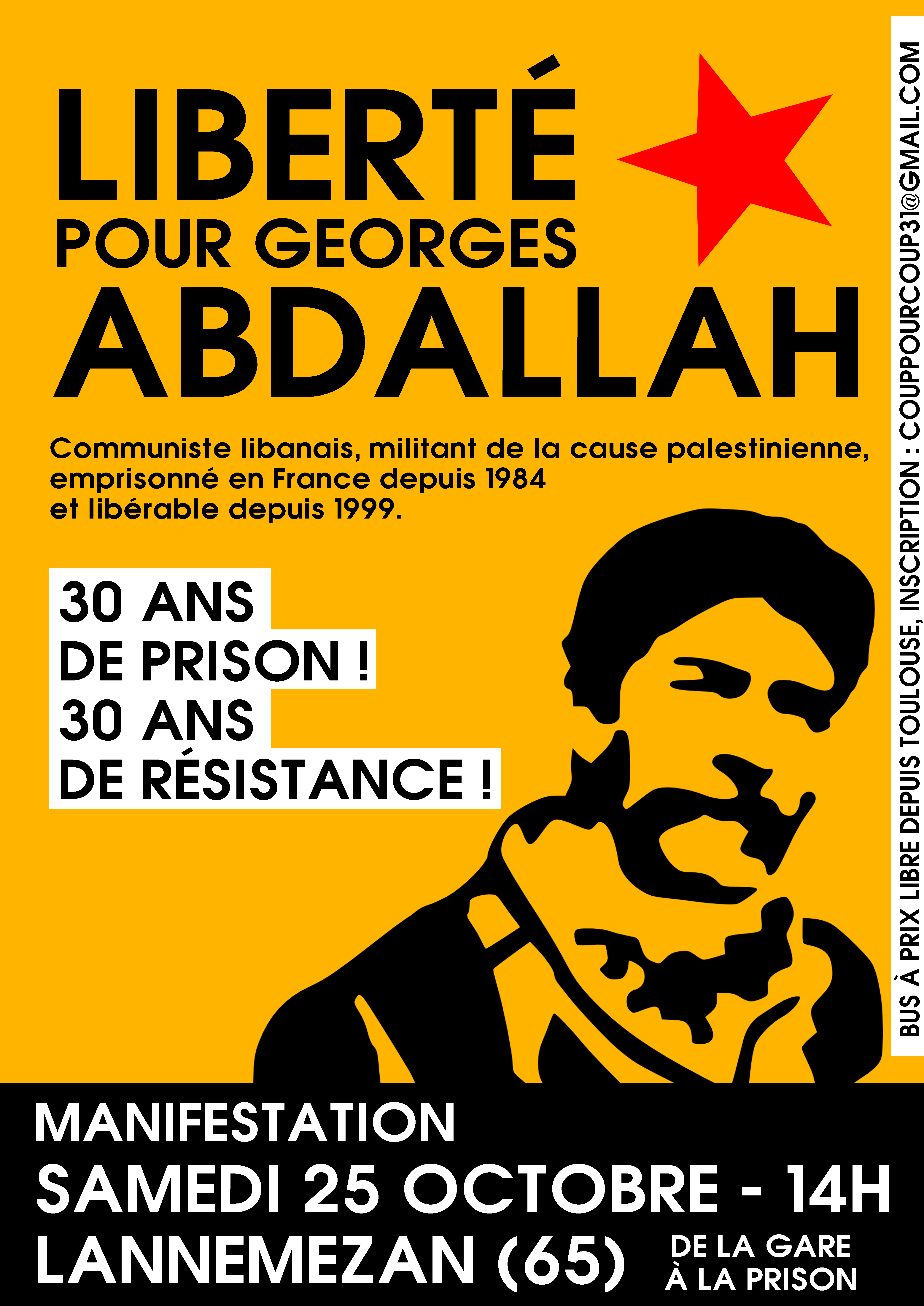 Soyons sûrs que seule une forte mobilisation populaire fera sortir Georges Abdallah de prison. Le samedi 25 octobre 2014 à 14h nous appelons à une manifestation unitaire de la gare à la prison de Lannemezan où il est enfermé.