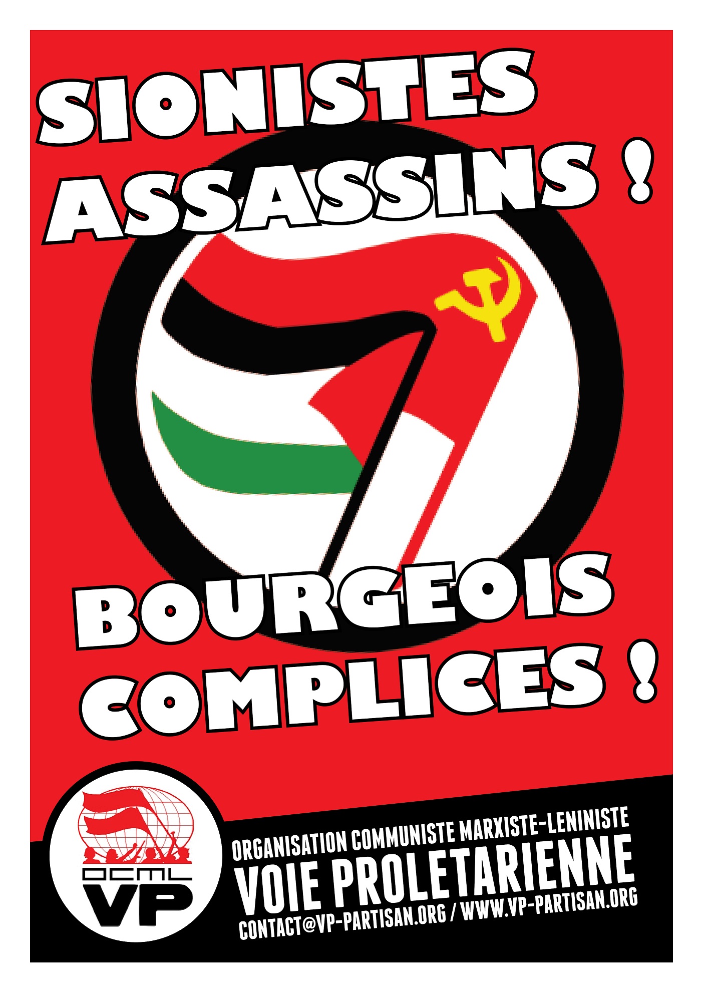 Aussi reprenons-nous à notre compte la déclaration des jeunes du FPLP (Front Populaire de Libération de la Palestine) du camp d’Aida, et de Bethléem qui affirme que « Sionisme et fascisme sont deux facettes de la même médaille : le capitalisme » et refusent « tout soutien de la part de ceux, qui depuis toujours, sont été le bras armé du patronat et du capital » et « de la part de ceux qui utilisent le drame du peuple (…) palestinien pour propager haine raciale et antisémite et défendre leurs petits intérêts ».