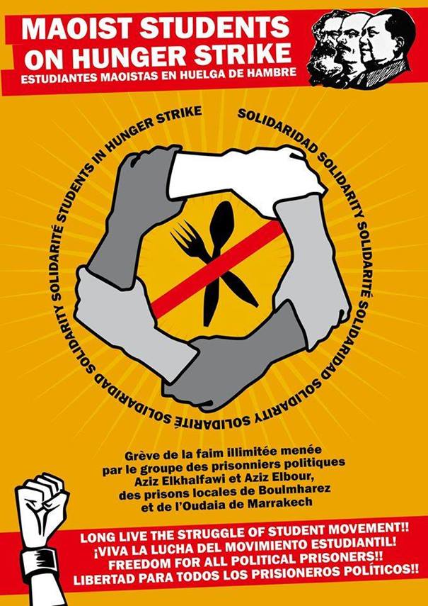 Depuis le 23.03.2015, ces prisonniers politiques maoïstes du groupe d’Aziz Elbour et de celui d’Aziz Elkhalfaoui, ont entamé et mènent au Maroc une grève de la faim illimitée, d’une part pour dénoncer les exactions et les agressions physiques et morales que ces camarades subissent au quotidien dans les geôles de la réaction et d’autre part pour faire aboutir et imposer leurs revendications justes et légitimes, ci-dessous rappelées :