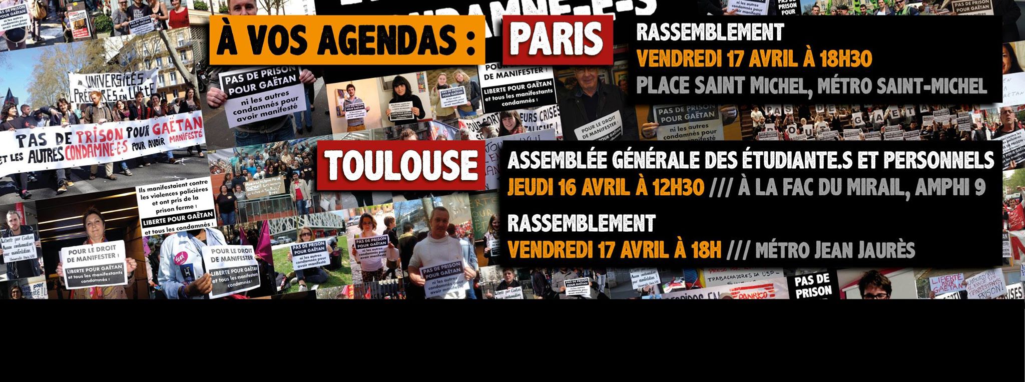 Afin de poursuivre et d’amplifier la mobilisation pour Gaëtan et les autres condamnés de Toulouse, et plus généralement contre la vague répressive qui frappe toutes celles et tous ceux qui résistent, nous appelons à un rassemblement de solidarité ce