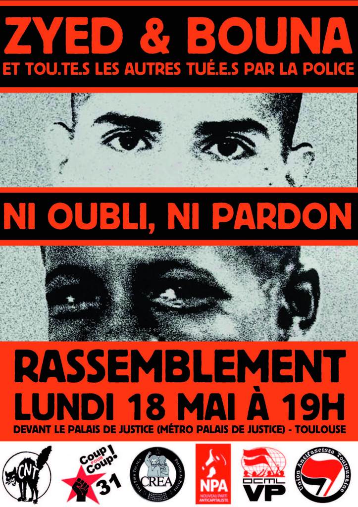De Pipo assassiné en 1998 à La Reynerie par la police à Timothée Lake assassiné en 2014 par cette même police, la ville de Toulouse se fait pleinement le relais de cette violence d’Etat. Nous dénonçons l’intensification de la répression qui est à l’œuvre dans la ville : interdictions des manifestations contre les violences policières, occupation de la ville par les forces de police, peines de prison ferme pour avoir osé manifester etc.