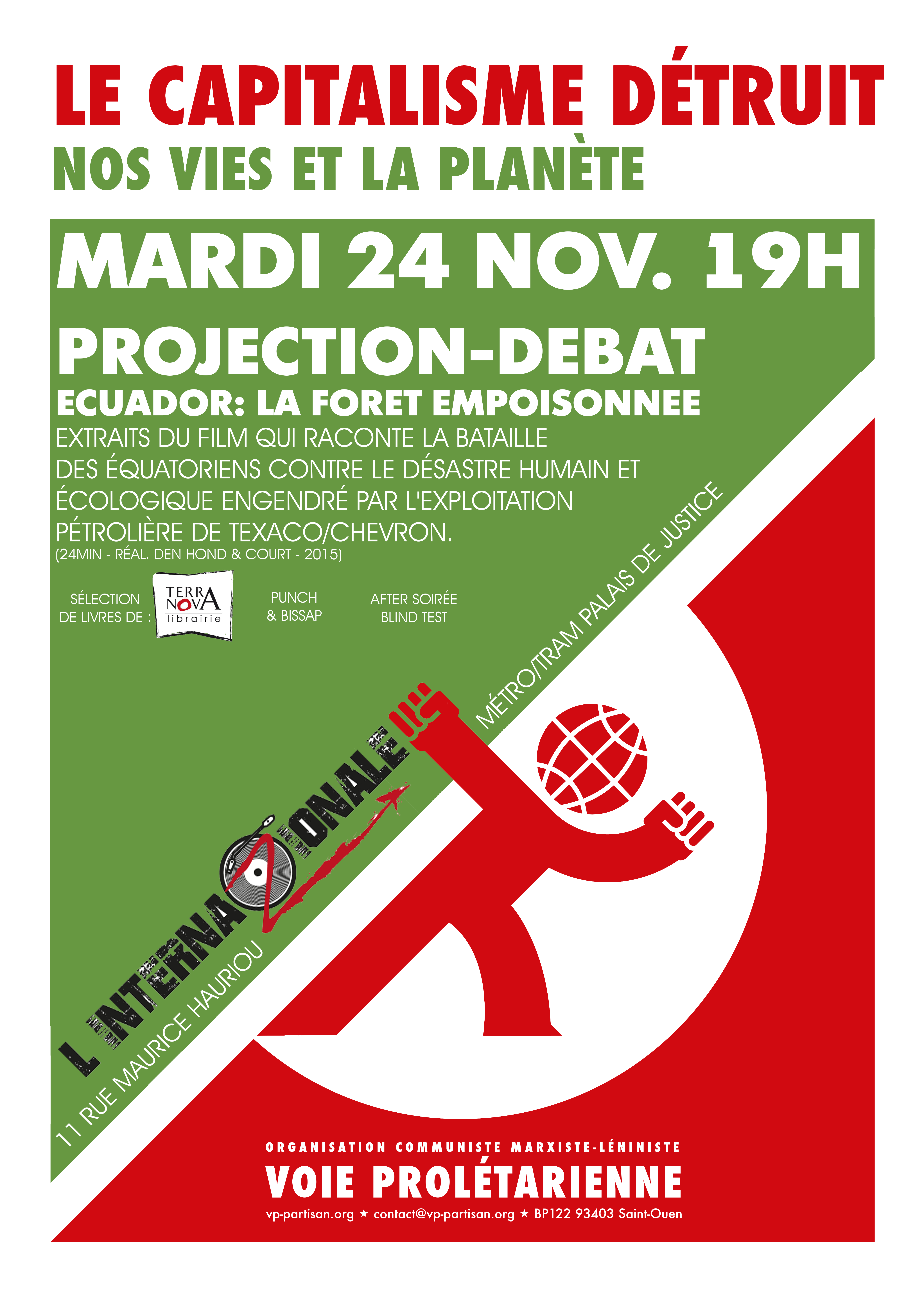 L’OCML Voie Prolétarienne Toulouse vous invite à une projection débat de "Ecuador : la forêt empoisonnée" (extraits - 24 min - réal. Den Hond & Court - 2015). Ce film raconte la bataille des équatoriens contre le désastre humain et écologique engendré par l’exploitation pétrolière de Texaco/Chevron.