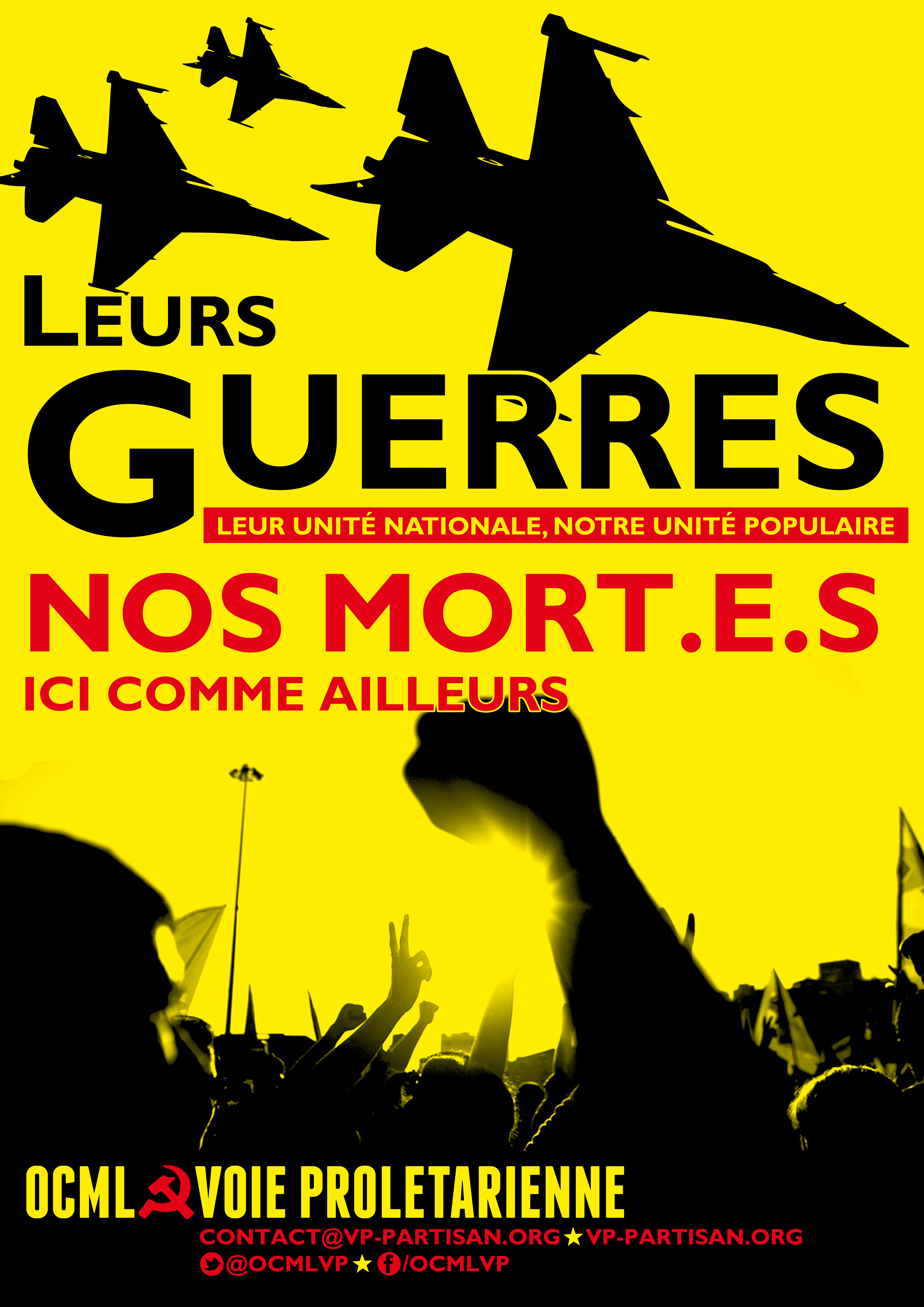C’est la guerre entend-on partout autour de nous. C’est vrai. Mais cette guerre n’est pas la nôtre, nous n’en sommes que les victimes. Sans oublier ceux qui sont en première ligne, l’ensemble des peuples du Moyen-Orient et d’Afrique. Les terroristes de Daech sont les fruits des interventions impérialistes depuis des dizaines d’années, la Russie, les USA, la France et les pays européens en Afghanistan, en Irak, en Afrique, en Syrie ou ailleurs… Les premiers responsables de ce carnage, ce sont nos gouvernements ! Nous dénonçons les alliances françaises et européennes avec la Turquie et l’Arabie Saoudite qui sont les soutiens de Daech. Nous exigeons l’arrêt de toutes les interventions, le retrait des troupes françaises, la fermeture des bases militaires !