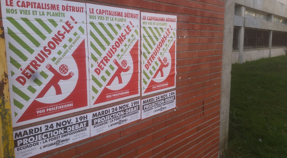 Nous l’avons fais d’abord parce que c’est évidemment l’actualité. Les attentats à Paris ont un peu fait oublier que la semaine prochaine s’ouvre à Paris la conférence sur le climat, la COP 21, réunissant pleins de chefs d’Etat. Ce sera une grande opération de com’ pour nous faire croire que le capitalisme est compatible avec la planète. Évidemment, nous voyons tous autour de nous l’impasse dans lequel il nous mène. Que soit par l’utilisation de l’amiante et autres produits chimiques dans nos taffs en se foutant des conséquences, ou encore les OGM, les risques nucléaires et j’en passe.