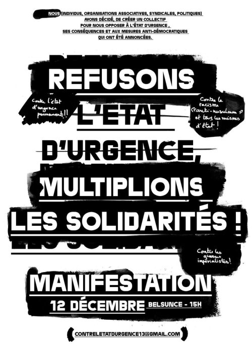 L’état d’urgence a été décrété puis prolongé pour trois mois. On en voit déjà les conséquences : interdictions de se rassembler, de manifester, gardes-à-vue, expulsions de squat, assignations à résidence, perquisitions violentes dans les lieux de vie et de culte, déchéance de la nationalité (y compris pour les bi-nationaux nés en France), fermeture des frontières, fichage généralisé (fiches S, fichage ADN, … ), contrôles accrus dans les transports, dans les centres commerciaux, à l’entrée des facs, dans les quartiers, … Toutes ces mesures répressives et préventives touchent en majorité des musulmanEs réelLEs ou supposéEs, des habitantEs des quartiers, et/ou des militantEs (syndicaux, politiques, associatifs, écologistes, etc.), donc qui n’ont rien à voir avec les attentats du 13 novembre.