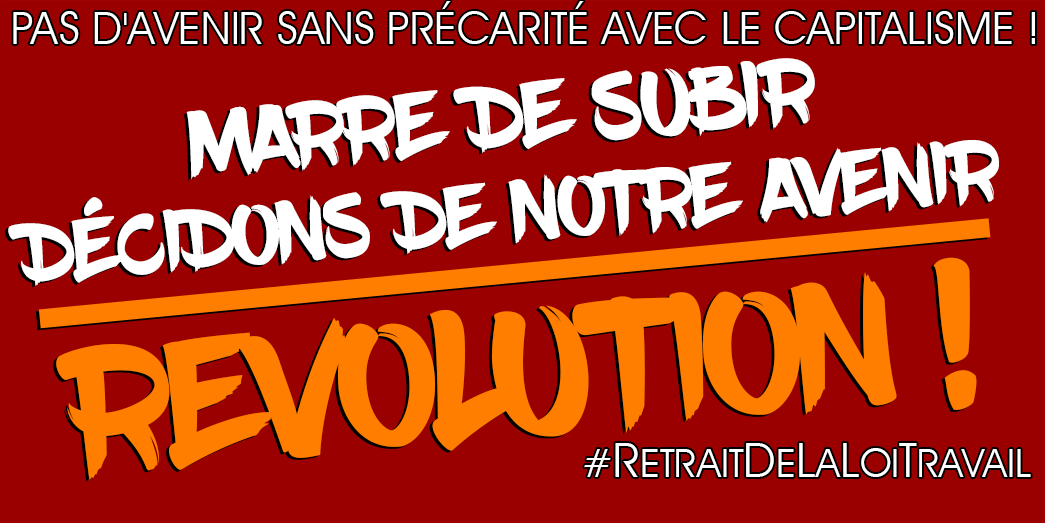 Du rejet de la loi El-Khomri à la Révolution ! La bataille contre ce projet de loi est un des moments de la bataille générale contre le capitalisme. Parce que ce système nous amène droit dans le mur (guerres, misère, catastrophe écologique…), nous ne proposons pas d’aménagement, nous ne disons pas que nous gérerons mieux que les autres. Nous disons qu’il faut s’organiser, pour ne pas être seul face à son chef, ou à un bulletin de vote, mais se construire un autre avenir ! Un avenir sans exploiteurs, de solidarité et non plus de concurrence et de précarité… où les travailleurs et la jeunesse populaire auront le pouvoir pour changer et diriger la société.