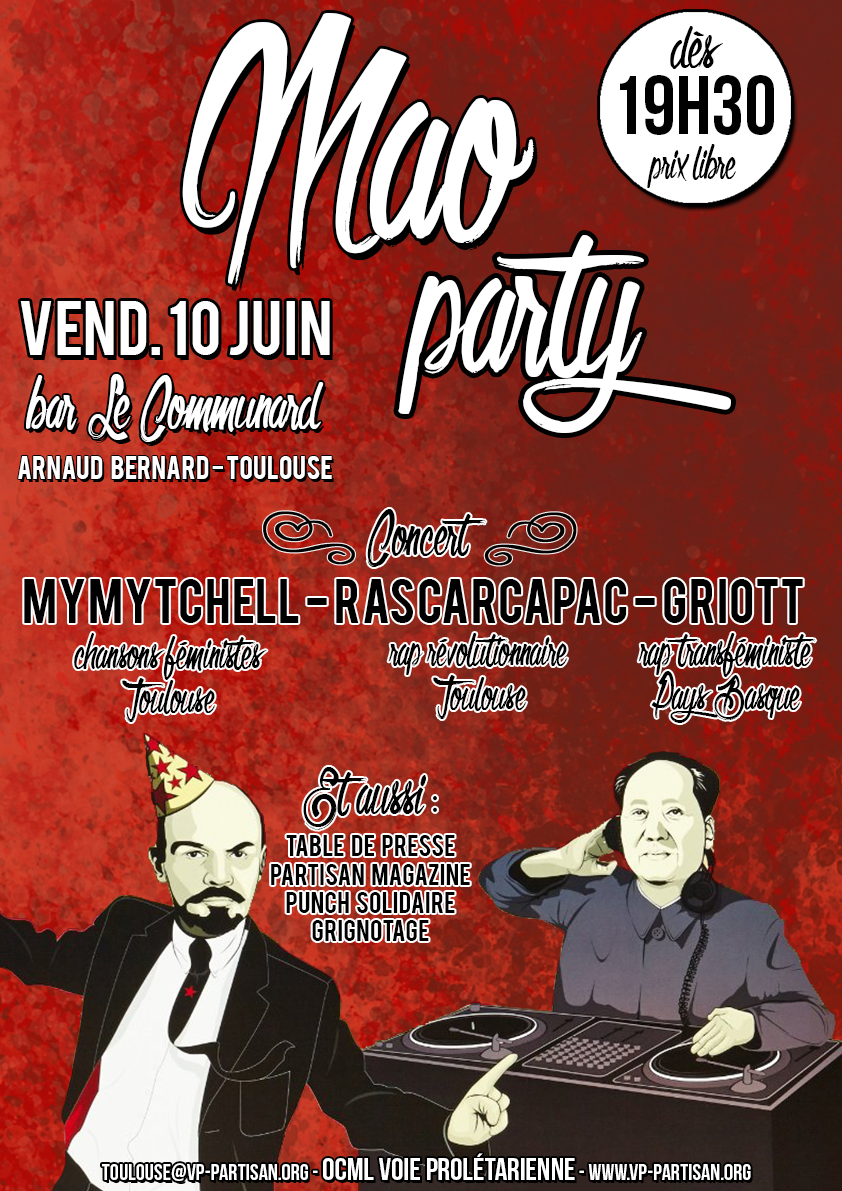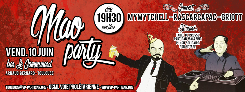Soirée-concert Mao Party vendredi 10 juin à Toulouse au bar Le Communard (place Arnaud Bernard) dès 19H30 (début des concerts à 21h).