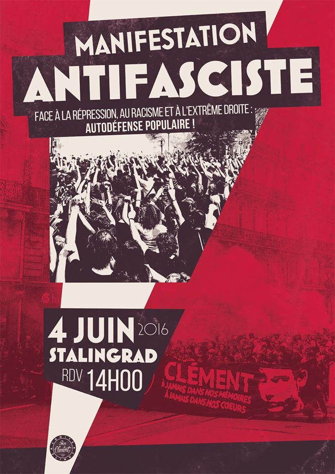 Parce que nous n’avons rien oublié du sourire de notre camarade ni de ses combats, parce que nous n’avons rien pardonné de l’infamie des fascistes qui l’ont tué et du système qui les produit, parce que nous n’entendons pas laisser sa mémoire aux mains des juges et des journalistes à l’occasion du procès qui approche, nous appelons à une manifestation antifasciste le samedi 4 juin 2016 à 14h à Stalingrad - Paris.