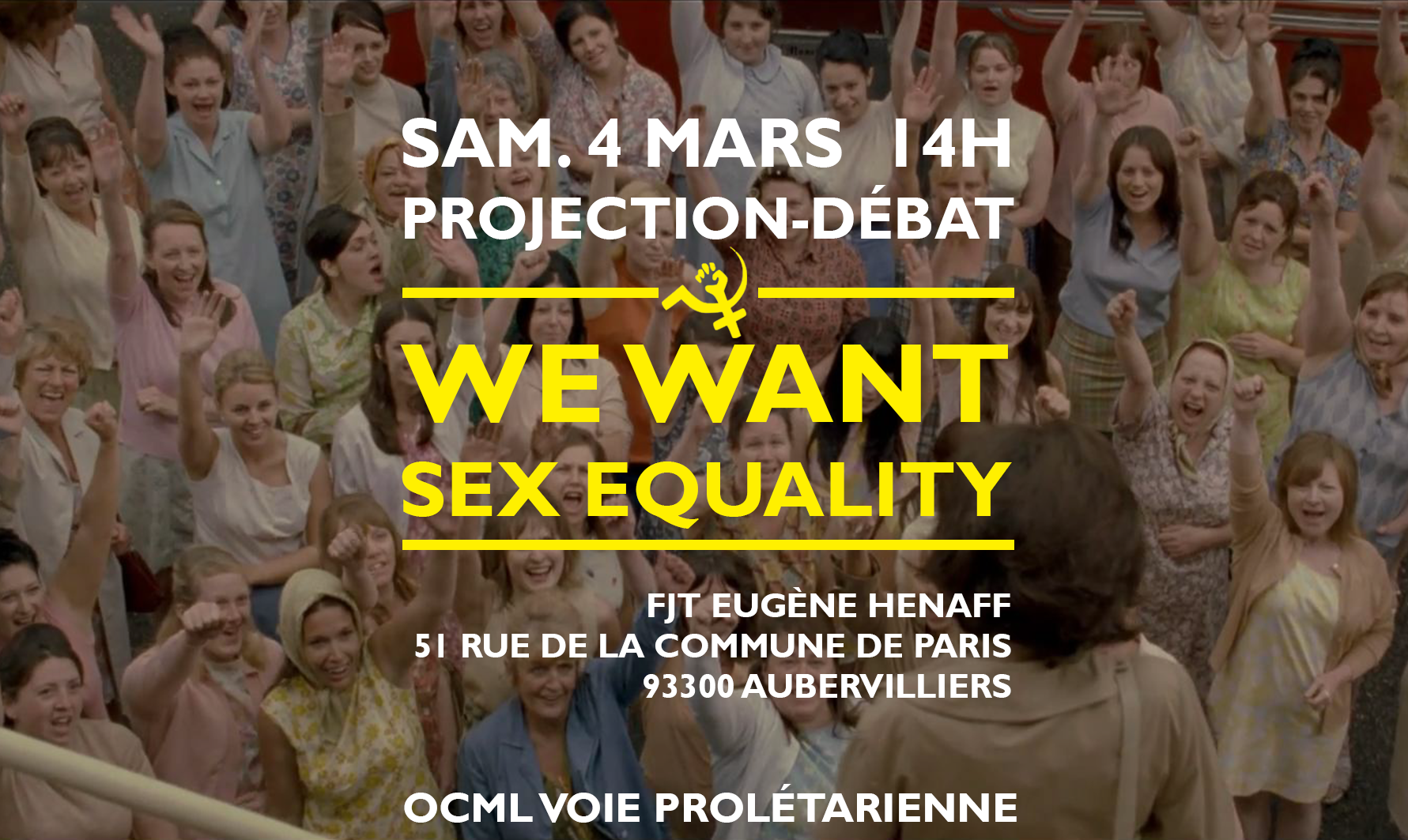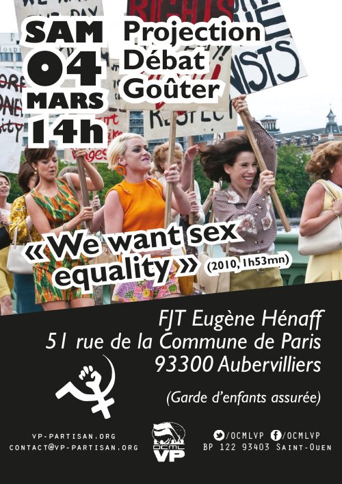 En prévision de la journée internationale des luttes des femmes qui aura lieu le 8 mars, l’OCML VP organise une projection du film « We want sex equality ». Le film raconte la lutte des ouvrières des usines Ford de la banlieue de Londres, pour l’égalité au travail et dans la société.