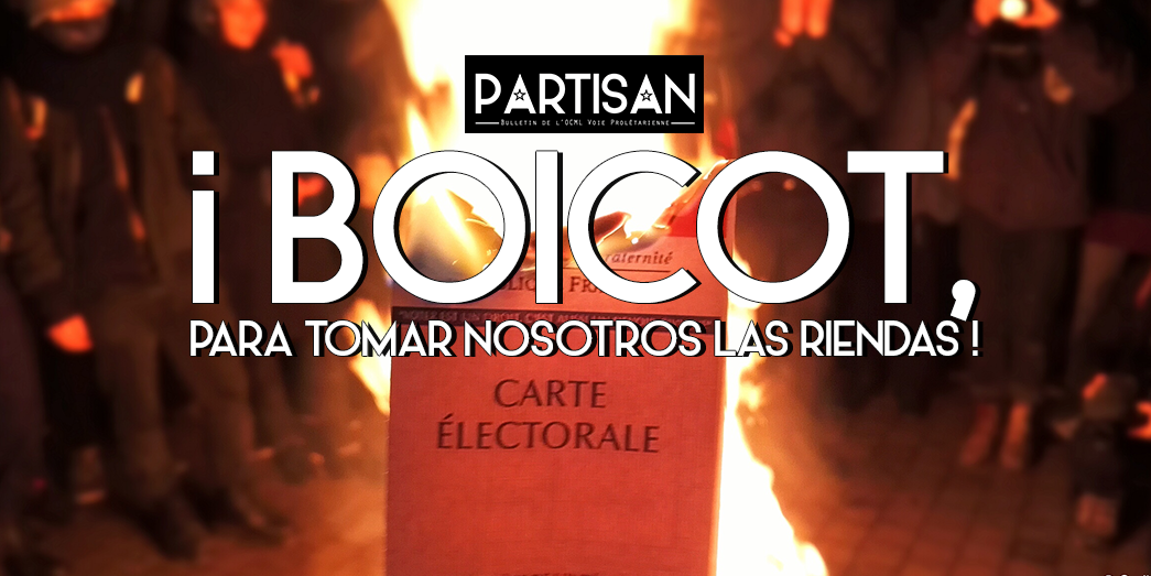 El boicot, es anunciar el combate contra el control burgués de la sociedad, es dar un paso hacia la decisión de qué hacer con nuestros problemas. Es negarse a doblegarse más tiempo a su juego electoral en el que votas un día y te quedas mirando el resto del tiempo. El boycott es, al contrario que su sistema, sentirse parte de la sociedad entera, de su funcionamiento y de sus evoluciones. Es posicionarse del lado de los sin papeles para exigir papeles para todos, es posicionarse con los migrantes por la libertad de circulación y de instalación, y con los romanís, con los jóvenes de los barrios populares por la igualdad, contra el racismo y las discriminaciones, es posicionarse del lado de los obreros en lucha contra los despidos, la miseria, por un trabajo que no destruya el cuerpo y la mente del trabajador, es posicionarse con los parados. El boicot, es oponer un proyecto emancipador y por la unidad de los explotados al auge de ideas reaccionarias ya sean las del FN, las de Fillon o compañía.