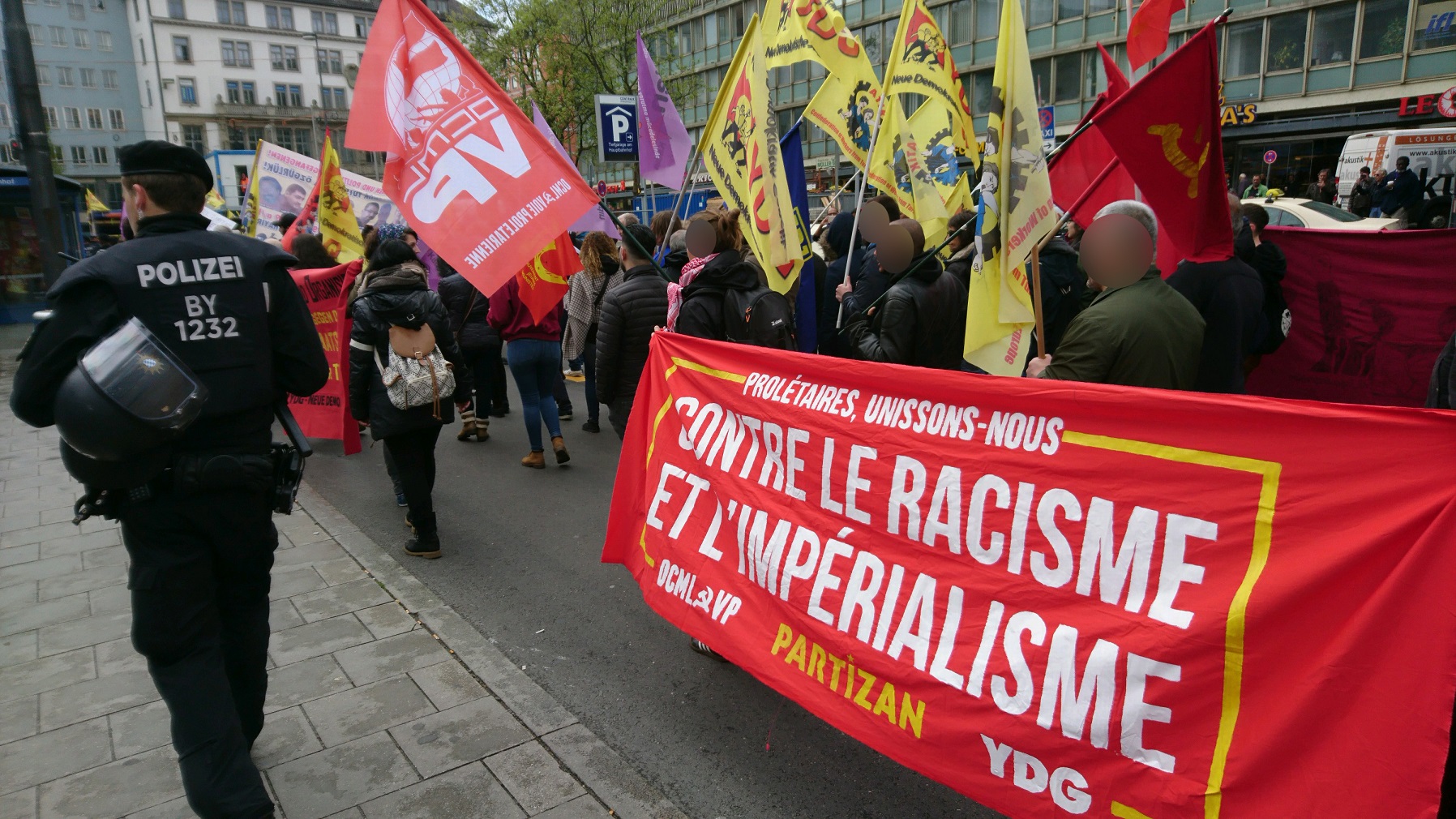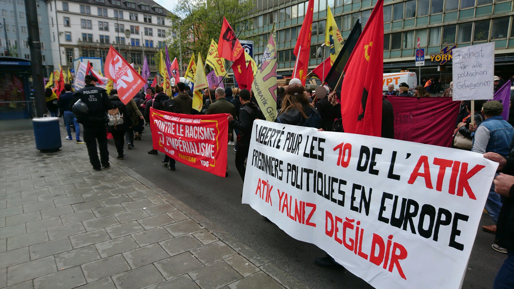 Pendant plus de 3 heures, la manifestation a parcouru les rues de Munich aux cris de slogans révolutionnaires en 5 langues (allemand, turc, anglais, italien et français) et affirmant l’engagement résolument antifasciste, anti-impérialiste et internationaliste de l’ATIK, YDG et Yeni Kadin (Nouvelle Femme).