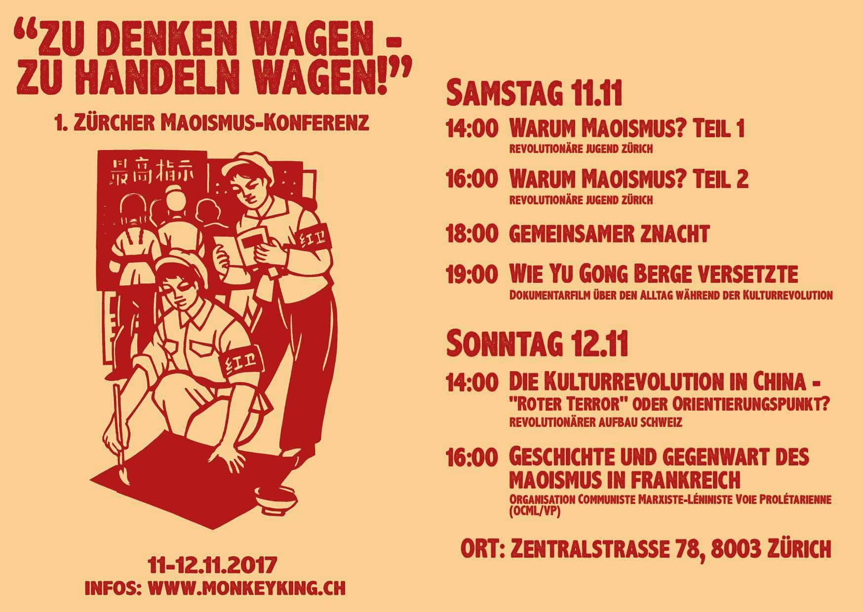 Le week-end du 11 et 12 novembre 2017, l’OCML VP participe au côté de la Jeunesse Révolutionnaire de Zürich (RJZ) et de Revolutionäre Aufbau à une conférence à Zürich "Oser penser - Oser agir !" sur les apports du maoïsme et notamment sur son histoire et son actualité en France.