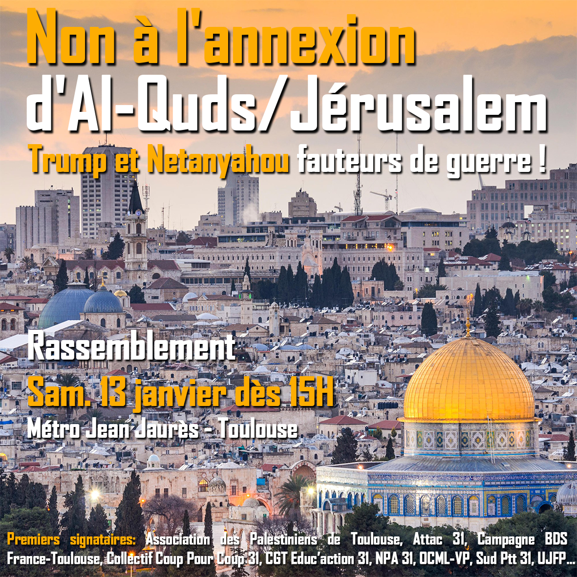 Premiers signataires : Association des Palestiniens de Toulouse, Association France Palestine Solidarité 31, Attac 31, Campagne BDS France-Toulouse, Collectif Coup pour Coup 31, CGT Educ’action31, Couserans-Palestine (09), La Voie démocratique France-Maroc, Comité 31 du Mouvement de la Paix, NPA 31, OCML-VP, PCF 31, Sud Ptt 31, Parti des Travailleurs (Tunisie), Union des EtudiantEs de Toulouse, Union Juive Française pour la Paix