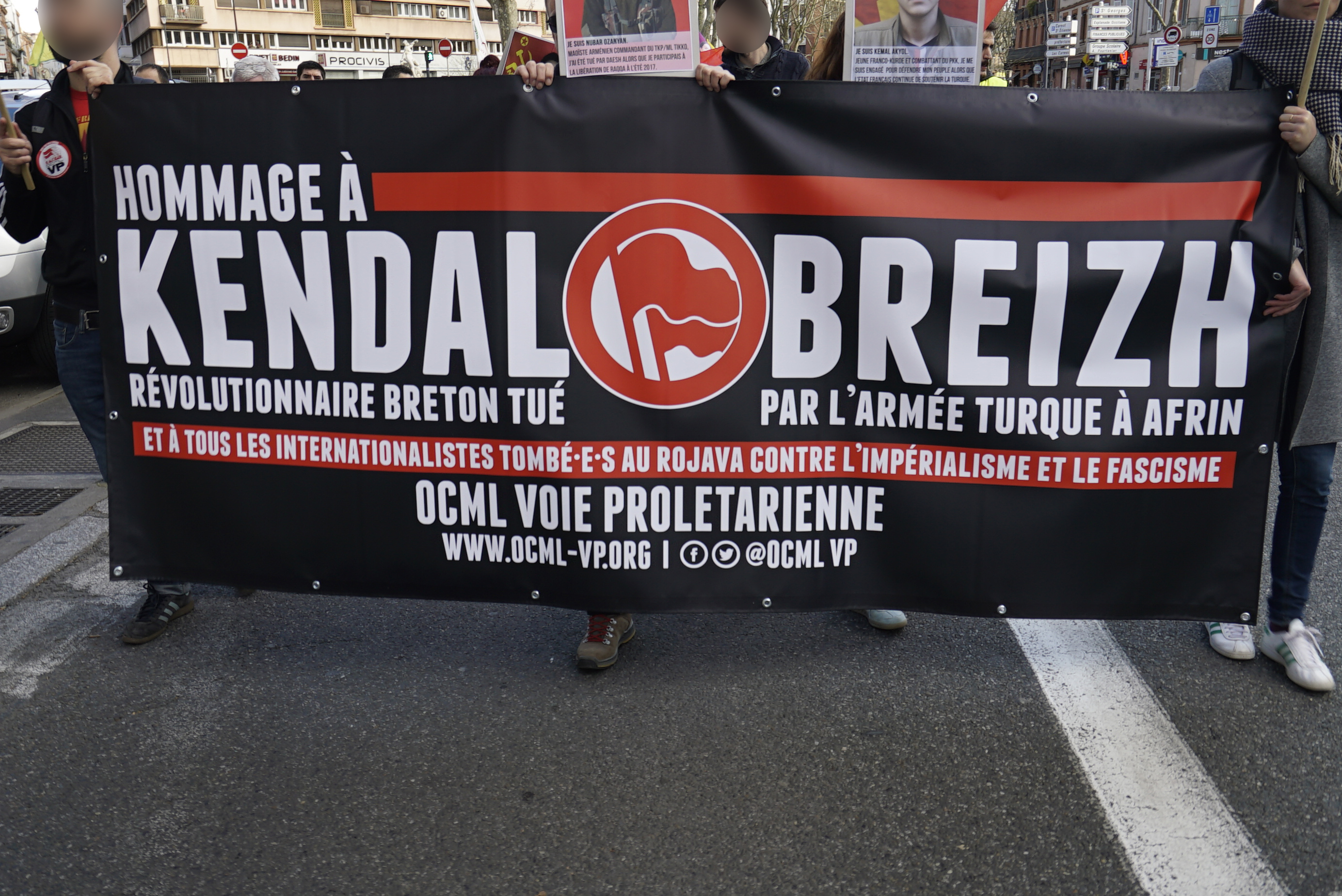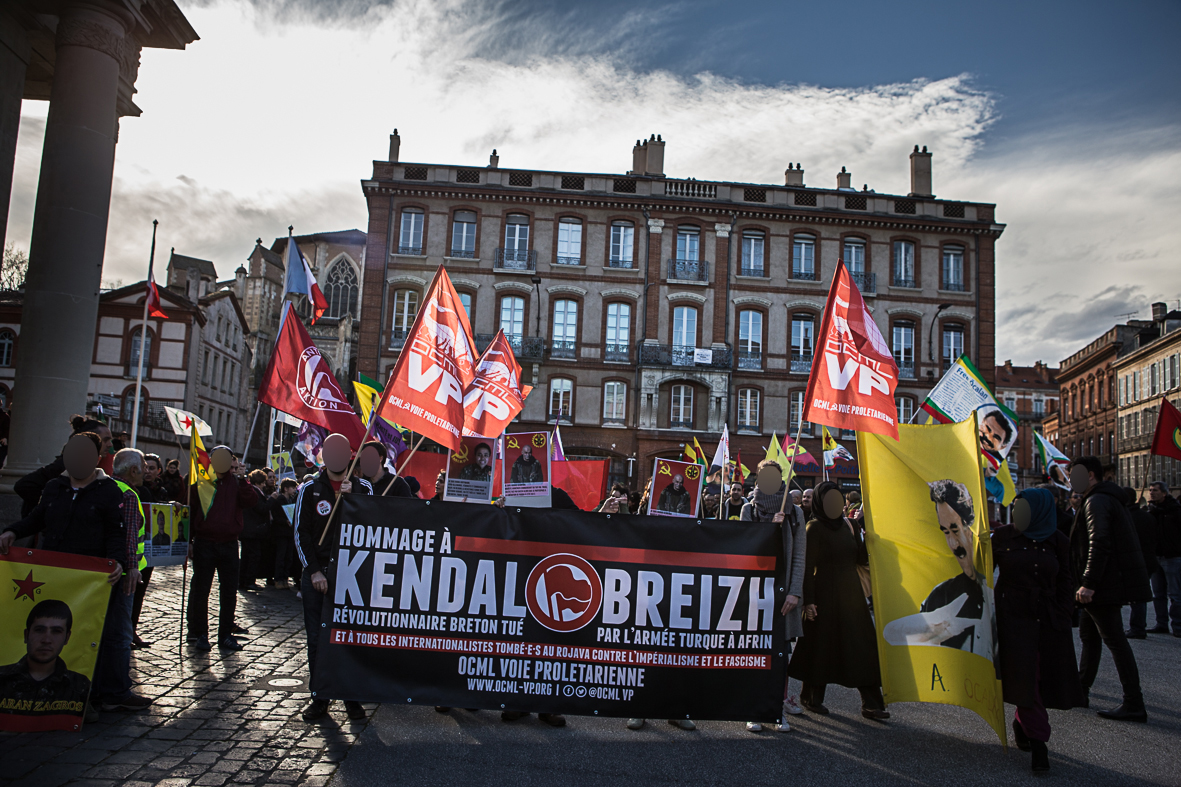 C’est finalement près de 300 personnes qui ont manifesté le samedi 10 mars dernier à Toulouse à l’appel de la Maison Franco-Kurde MP, du CSPK et de l’OCML VP en soutien à la Résistance d’Afrin et en hommage à Kendal Breizh et tous les internationalistes tombé-e-s au Rojava. La manifestation allant du Monument aux Morts à Capitole était ouverte par notre banderole "Hommage à Kendal Breizh et tous les internationalistes tombé-e-s au Rojava contre l’impérialisme et le fascisme".