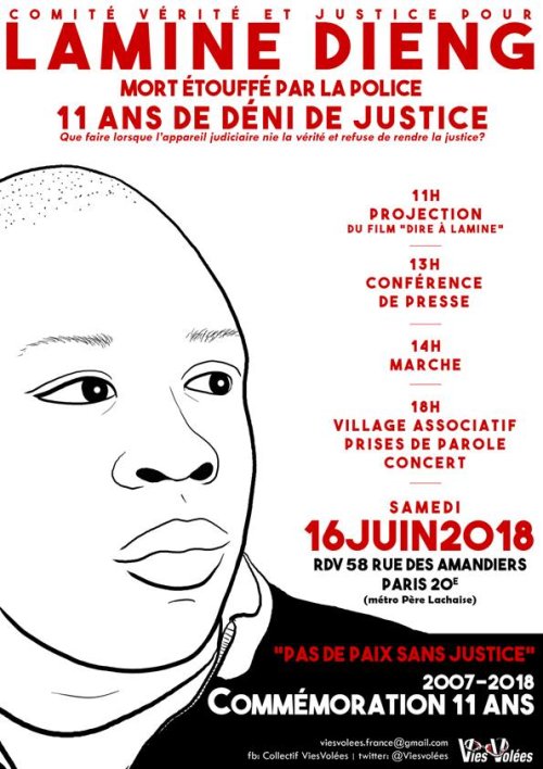 Lamine Dieng, 11 ans déjà. Lamine, mort par asphyxie, tué par la police et les techniques d’immobilisation létales qu’elle utilise. 11 ans de combat acharné pour faire connaître la vérité et tenter d’obtenir justice, 11 ans de combat judiciaire aussi. En vain, malgré la détermination sans faille des proches de Lamine, du comité de soutien, et depuis, tant d’autres victimes de crimes policiers ! C’est Ali Ziri à Argenteuil, c’est Adama Traoré à Beaumont/Oise, c’est aussi toutes les victimes moins connues, certaines dont personne n’entendra jamais parler. Alors NON, pour Lamine, Ali, Adama et tous les autres, NI OUBLI, NI PARDON ! JAMAIS.