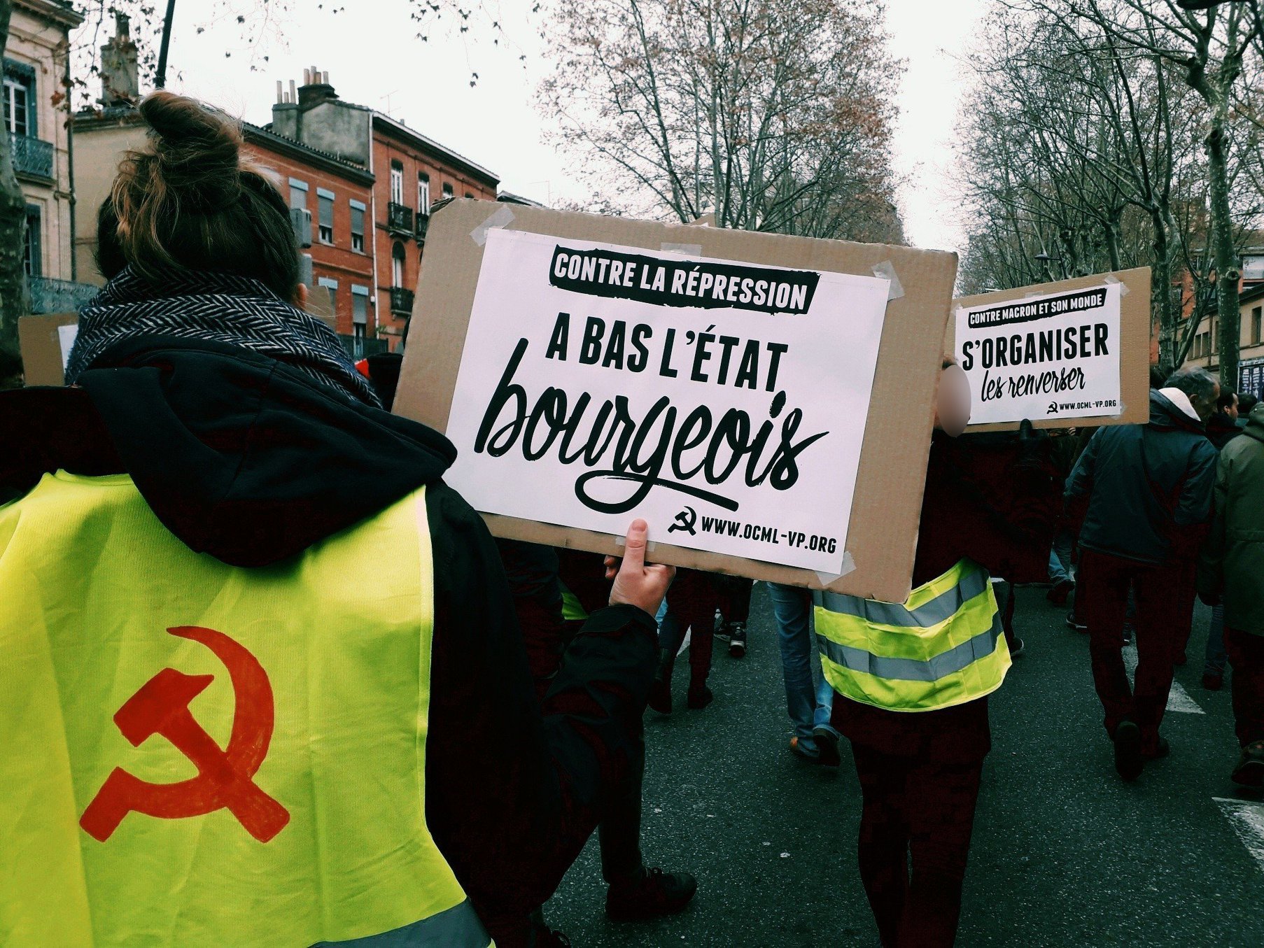 With the absent of the trade unions and the parties, this movement is a good example of a spontaneous uprising of the people. We had not seen this in France since the riots in working class neighborhoods in 2005. This shows that the exploited do not need organizations to revolt. At the political level, many people understand with this movement that to change things, we will have to take our own issues in our hand. The most combative, the most conscious people ask themselves good questions : the use of violence to achieve our ends ; the question of power too : "Macron resignation ? ", but what will happen after ? However, we can see that the movement is starting to show signs of slowing down. The demonstrations are a little less massive, the claims fish for lack of unity : spontaneity begins to show its limits. Faced with the state and its fierce repression, to overthrow capitalism and really change things, the exploited need a solid fighting organization, and headquarters. In short, a communist party. Our organization remains small, we do not pretend to be this party nor the means to influence the general line of the movement on communist and revolutionary bases. On the other hand, we have the capacity to advance the consciousness of the most combative people, and to reinforce us where we intervene daily, in the companies and the popular districts where we are, as OCML-VP or via work in mass collectives and trade unions. At our level, this is what we are working on in this movement.