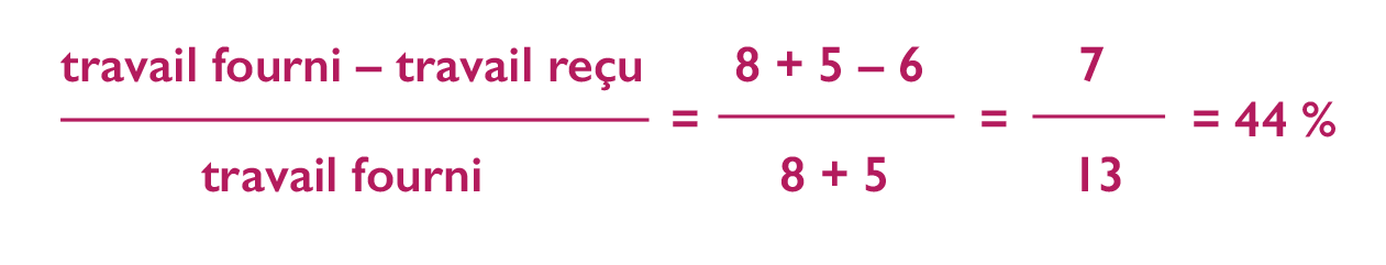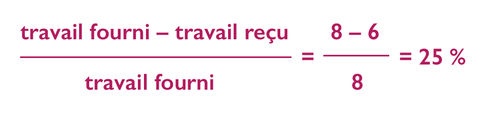 Qu’en est-il pour l’homme et pour la femme ? Chacun a fourni 8 heures de travail mais n’a reçu de travail social (d’eux-mêmes et de la société) que 6 heures. Le reste de leur travail a profité à d’autres (les capitalistes). De leur point de vue, par rapport au travail fourni, leur taux d’exploitation est :