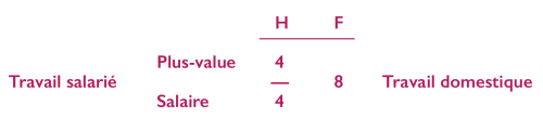 Pour aider à comprendre le mécanisme de l’exploitation indirecte du travail domestique, nous donnons ici un exemple numérique, forcément schématique. Pour faire vivre un ménage d’ouvriers, avec 1 ou 2 enfants, il faut exercer chaque jour 8 heures de travail domestique (cf. encadré 3) : il s’exerce sur des objets de travail (aliments crus, tissus, meubles, etc.) avec des moyens de travail (ustensiles, balais, etc.). La consommation de ces denrées, l’usure de ces ustensiles équivalent environ à 4 heures de travail social dans le cadre de la production capitaliste (on comprendra plus loin pourquoi on donne ces chiffres). Au total, donc, le travail pour entretenir un ménage représente 12 heures : 4 heures de production capitaliste (objets et moyens de travail achetés) + 8 heures de travail domestique. Disons pour simplifier que cela représente 6 heures dont « profite » la femme et 6 heures pour l’homme : 6 heures de travail social nécessaires pour reproduire le travailleur (reproduire sa force de travail présente, et la force de travail future oui le remplacera : son enfant).
