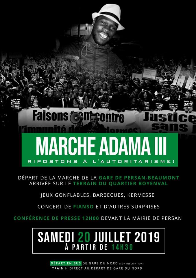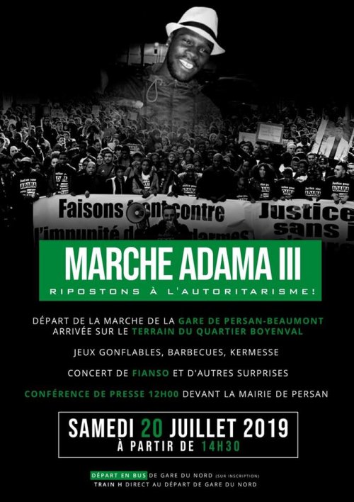 Le deuxième acte collectif de cette riposte, ce sera la MARCHE ADAMA III, le 20 juillet 2019 à Beaumont-sur-Oise, 14h30 au départ de la Gare de Persan-Beaumont.