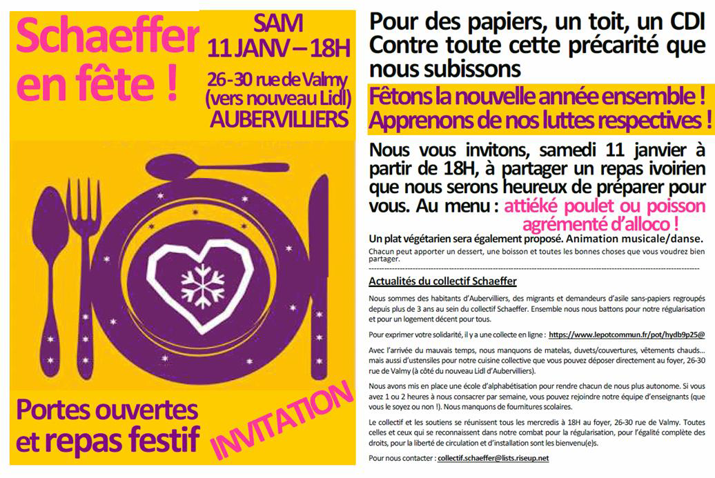 Le samedi 11 janvier, le collectif de travailleurs migrants Schaeffer d’Aubervilliers (dont l’OCML-VP est un soutien actif) "invite toutes celles et ceux qui se battent pour l’égalité complète des droits, contre la sous-traitance et la précarité à fêter la nouvelle année ensemble autour d’un bon repas ivoirien que le collectif sera heureux offrir.