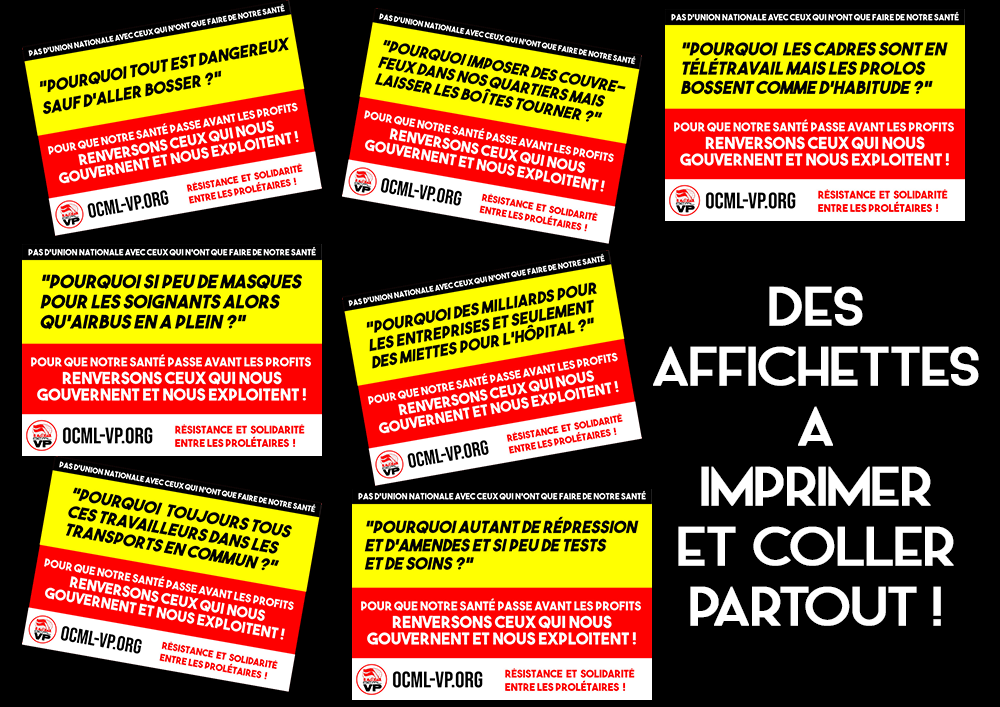 Une série de sept affichettes pour interpeller autour de nous sur le Coronavirus, rompre les tentatives d’Union Nationale et démarquer le camp des ouvriers. A retrouver ici : http://ocml-vp.org/rubrique24.html