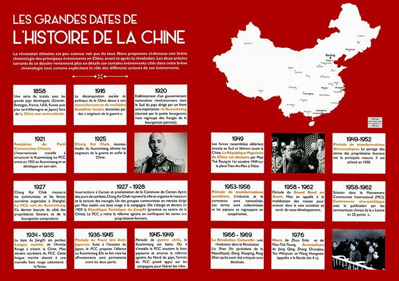 La révolution chinoise est peu connue, voire pas du tout. Nous proposons ci-dessous une brève chronologie des principaux événements en Chine, avant et après la révolution. Les deux articles suivants de ce dossier reviennent plus en détail sur certains événements cités dans cette brève chronologie tout comme explicitent le rôle des différents acteurs de ces événements.