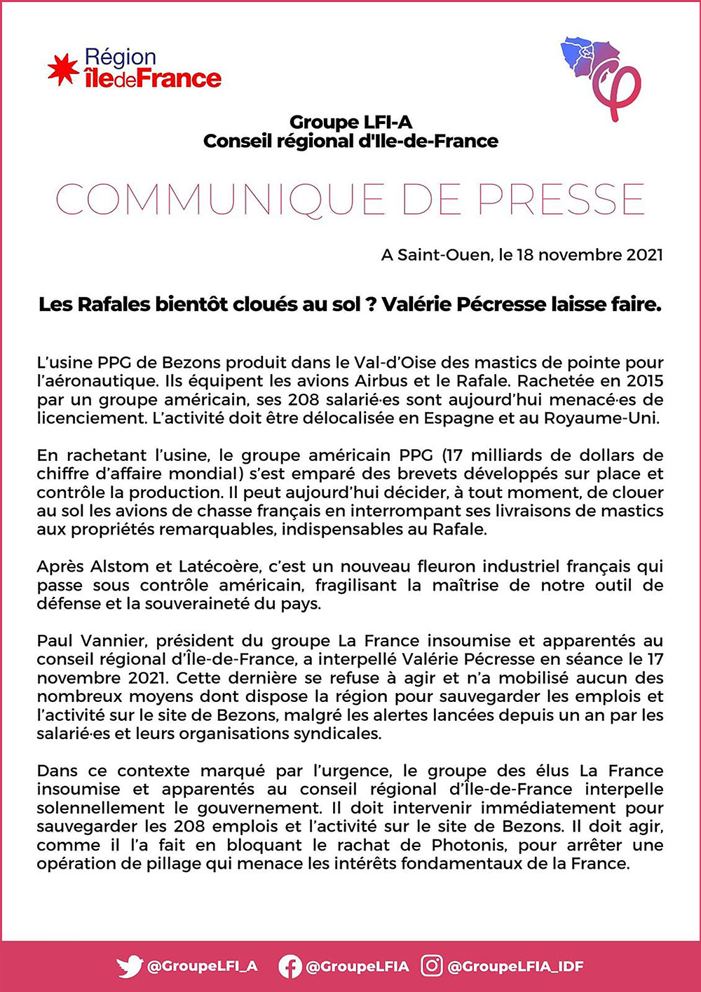 Les élus insoumis au Conseil Régional d’Ile de France ont publié le 18 novembre un communiqué malheureusement trop confidentiel en défense des travailleurs de PPG (Bezons) menacés de licenciement. Jusque-là rien à dire, les PPG se battent durement (et justement) pour l’emploi et contre les licenciements, aux côtés des TUI et d’autres, et sont les principaux animateurs des manifestations en défense de l’emploi, celle du 23 janvier, et celle plus récente du 27 novembre. Manifestations où l’on voit les élu.e.s FI toujours en bonne place, iels sont présent.e.s, toujours rien à dire.