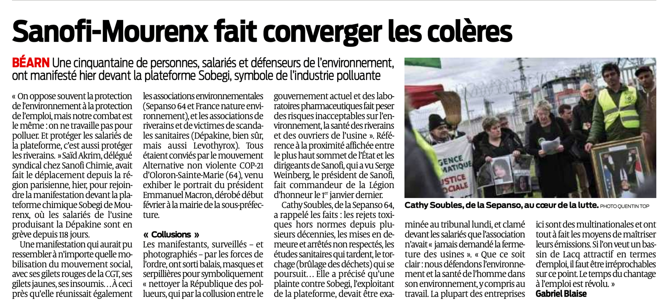 Résistance des associations victimes de l’amiante, des victimes de Bhopal ou AZF ou les riverains de Lubrizol. Ou de manière inédite et plutôt d’avant-garde, l’unité des syndicats d’une usine chimique et des riverains de la zone pour combattre les toxiques chimiques et médicamenteux. C’est le cas sur la zone industrielle chimique de Mourenx (dans les Pyrénées atlantiques, à côté de l’ancien gisement de gaz de Lacq), où l’usine SANOFI fabrique la Dépakine, un des nombreux scandales médicamenteux sanitaires du moment. Dans l’unité, la CGT et les associations environnementales de riverains combattent les risques chimiques de l’usine, comme on peut le voir dans l’article de Sud-Ouest du 18 février. Ici, les locaux ont surmonté la vieille division entre les syndicats (défendre l’emploi à tout prix, en fermant les yeux sur les risques) et les riverains (demander la fermeture de l’usine), pour construire une unité solide, base d’une opposition de classe.