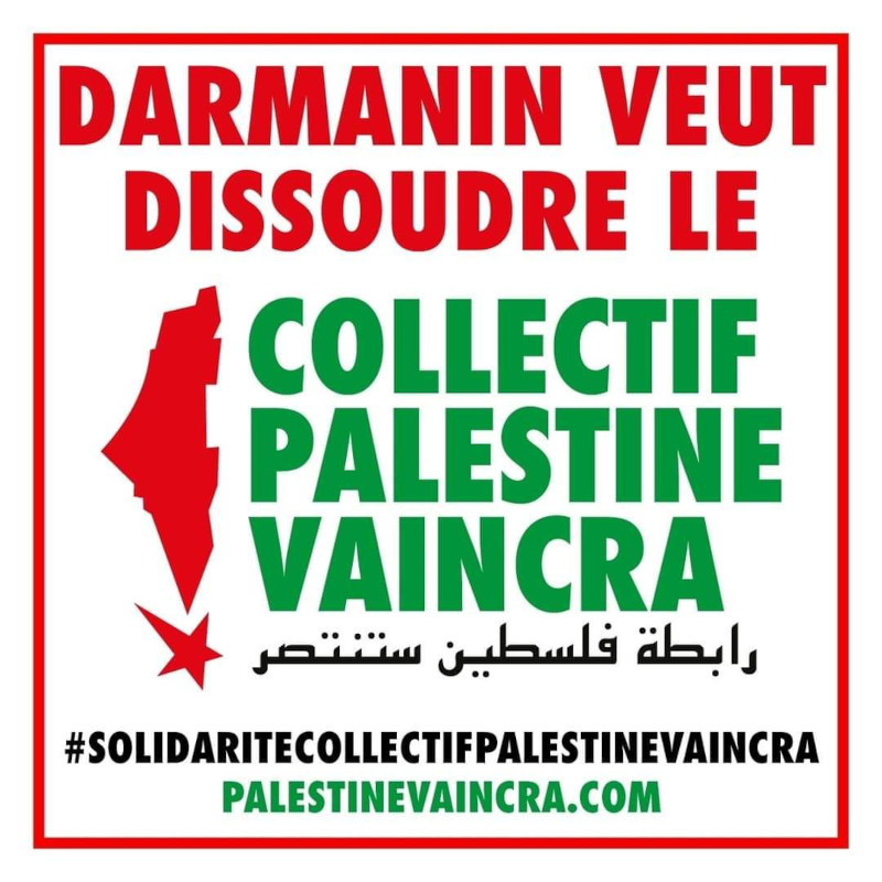 Gérard Darmanin souhaite faire dissoudre le Collectif Palestine Vaincra. Ce collectif est très actif à Toulouse dans le mouvement de solidarité avec le Peuple palestinien et est le principal soutien de Georges Ibrahim Abdallah. Il relaie les positions de la principale organisation de la Gauche palestinienne, le Front populaire de libération de la Palestine.