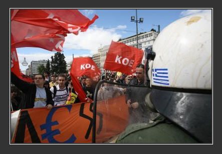 (...) Le gouvernement Papandreou met le pays au bord du gouffre. Il confisque les salaires et les pensions. Dans le même temps, il ne prend même pas 1 euro de plus aux riches. Il n’a même pas réduit de 1 euro les dépenses militaires et les commandes d’armements. Il ne demande même pas 1 euro de plus aux banques, les plus grands voleurs du peuple. Le gouvernement Papandréou (social-démocrate) a réussi, en un temps très court, à devenir encore plus antipopulaire que les gouvernements détestés de droite de Mitsotakis et Karamanlis.