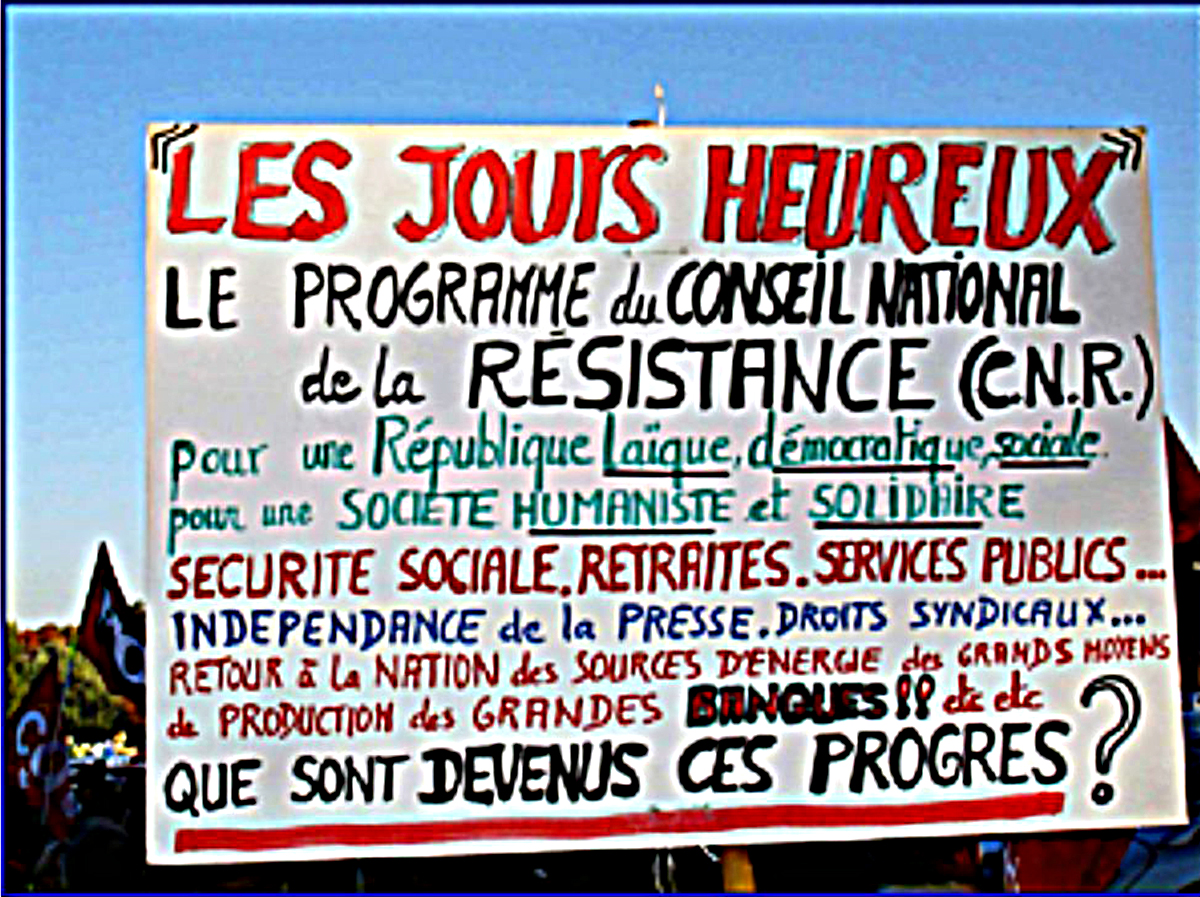 Le programme du CNR est un programme de collaboration de classe. Il a permis au PCF de passer de la résistance démocratique contre le nazisme, à la collaboration de classe avec le gaullisme. Le NPA et Lutte Ouvrière, contrairement aux partis de gauche, reconnaissent cette vérité. Mais ils restent emmerdés. Par quoi ? Par la défense des acquis de l’époque, qui furent tout de même de véritables avancées. Comment donc concilier un discours révolutionnaire et une pratique vulgairement syndicaliste ?