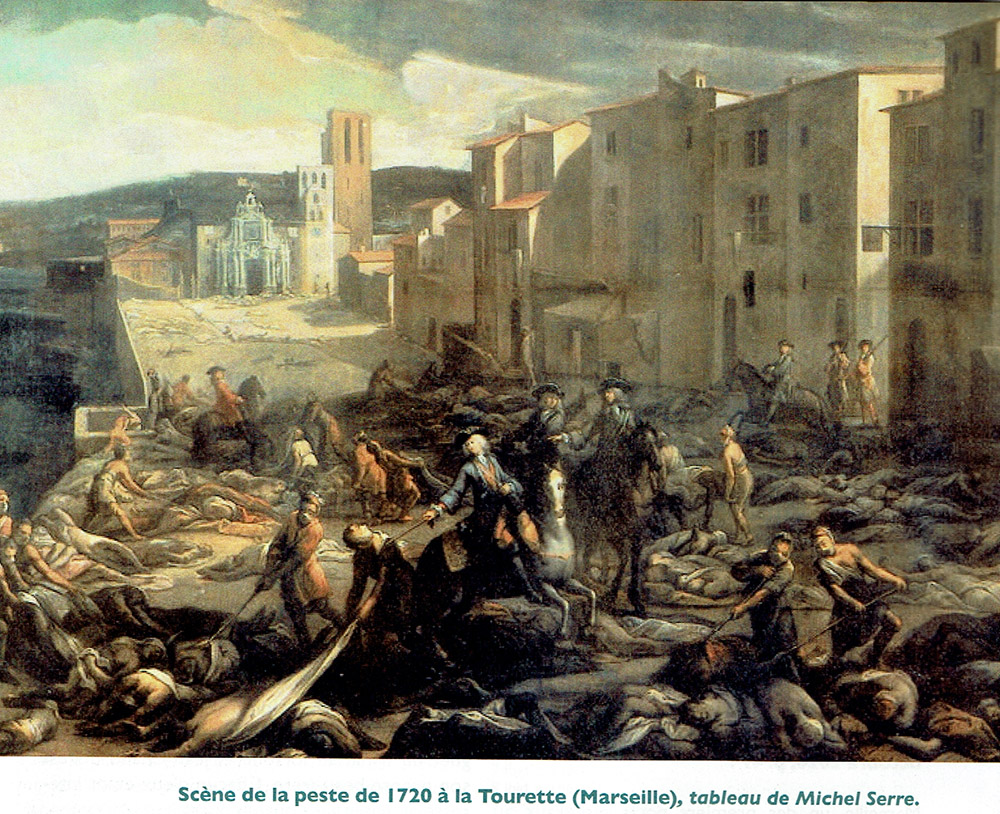 Marseille, un des premiers ports mondiaux au XVIIIe siècle, devait se protéger de la peste que pouvaient rapporter les navires marchands commerçant avec les pays du Levant. Le complexe sanitaire marseillais était alors considéré comme un modèle d’organisation : il comprenait un « bureau de la Santé », qui gérait un port pour la quarantaine des navires, et un lazaret pour la quarantaine des marchandises et l’isolement des passagers. (…) Cependant, le « mal » dormait dans les cales d’un navire, le Grand Saint-Antoine, arrivé du Proche-Orient en 1720. Cette année-là, malgré toutes ces précautions, la cupidité des hommes provoqua la dernière grande épidémie de peste.