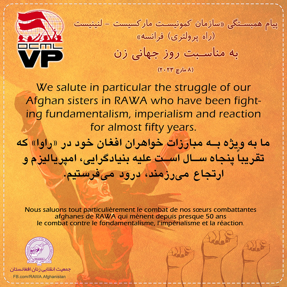 Nous saluons tout particulièrement le combat de nos sœurs combattantes afghanes de RAWA qui mènent depuis presque 50 ans le combat contre le fondamentalisme, l’impérialisme et la réaction.
