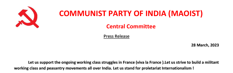 Le Comité central du CPI (maoïste), de son âme et de son cœur, apporte sa solidarité aux mouvements de la classe ouvrière française en cours et les encourage à porter haut la bannière du drapeau rouge des travailleurs. Le CC appelle toutes les organisations de classe et de masse, les travailleurs, la paysannerie, les étudiants, les intellectuels, les Adivasis, les Dalits, les organisations de femmes et de nationalités à organiser des manifestations pour soutenir la lutte de la classe ouvrière en France et dans le monde entier et appelle également à construire un mouvement militant de la classe ouvrière et de la paysannerie en Inde. Marx a souligné à juste titre que "le capital vient au monde dégoulinant de sang et de saleté par tous ses pores, de la tête aux pieds" et que la seule émancipation de la classe ouvrière consiste à détruire le système capitaliste de toutes ses forces.