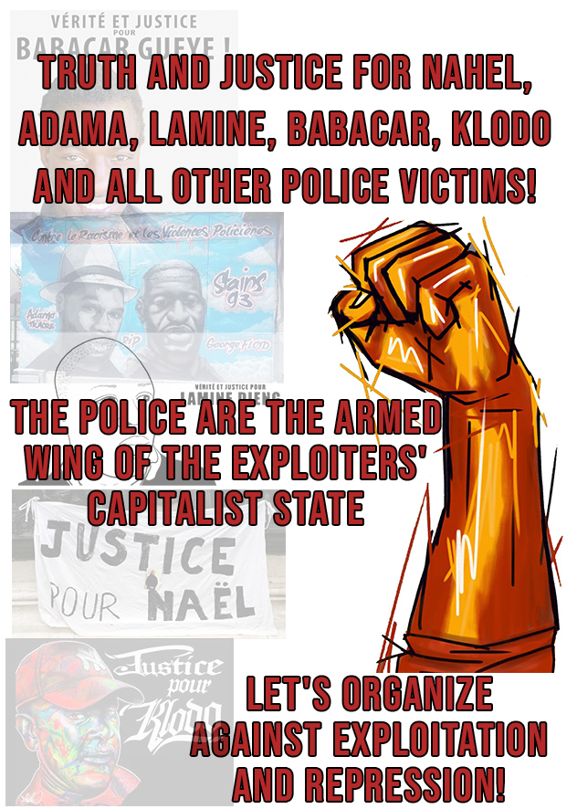 Young people are right to fight the police : it’s the armed wing of the state that can’t be improved, and we have to fight it to the bitter end. In a class-based society, the police have always been and always will be at the service of the exploiters, the enemies of the proletarians. Racism, and more generally fascistic ideas, permeate a majority of police officers, and explain their daily outburst of violence. Yes, police = murderers !