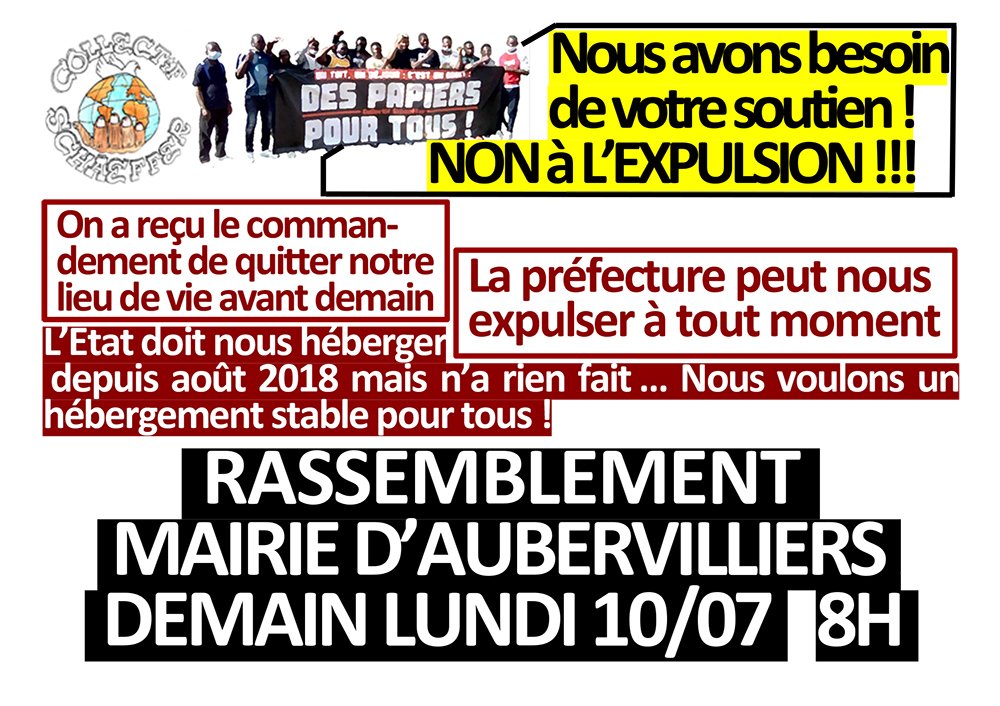 Lundi 10 et Jeudi 13 juillet, deux rassemblements se sont tenus devant la mairie d’Aubervilliers pour demander à être reçus – sans succès malgré une demande tout à fait officielle de la CGT Saint-Gobain. Un nouveau rassemblement est prévu le mardi 18 juillet à 10h devant la préfecture de Bobigny, toujours pour être reçus et avoir enfin une solution de relogement et la régularisation.