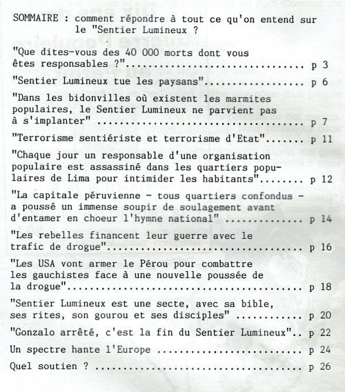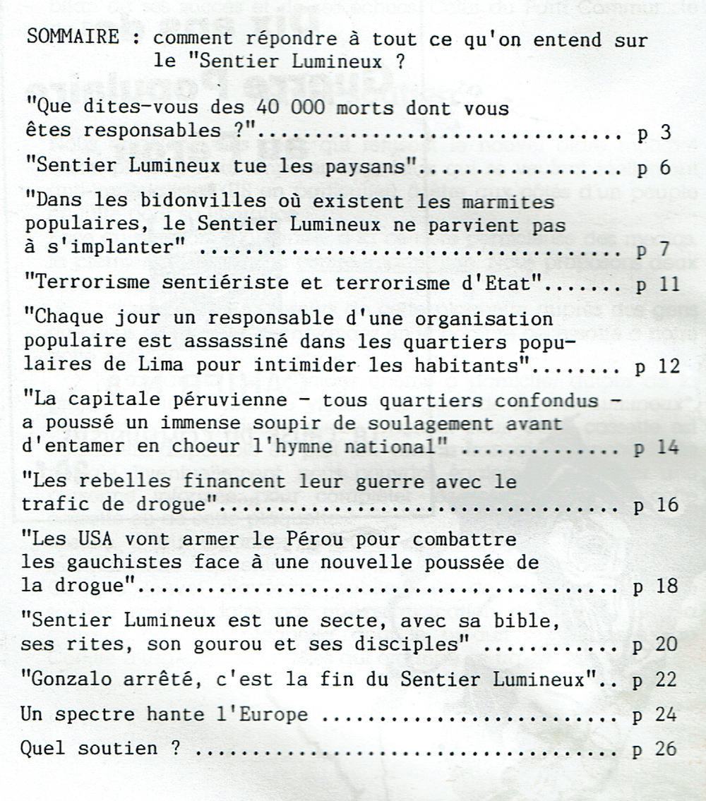 Cette brochure a été rédigée et diffusée dans la foulée de l’arrestation mi-septembre 1992 d’Abimaël Guzman et d’une grande partie de la direction du PCP, pour répondre aux torrents d’insultes et de boue répandus dans les médias sur la Guerre Populaire au Pérou.