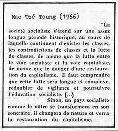 « Poursuivre la lutte des classes sous la dictature du prolétariat », pour « lutter contre la formation d’une nouvelle bourgeoisie » était une des leçons essentielles de la Révolution Culturelle, comprise à partir du bilan des pays de l’Est, comme un des points clé de la survie du socialisme et de la marche au communisme. Celle-ci n’a rien d’évident, et il y a toujours deux voies qui s’affrontent : celle des révolutionnaires qui veulent aller de l’avant, supprimer toutes les séquelles du capitalisme, bouleverser de fond en comble la société, et celle de la stabilisation, de la soumission aux règles économiques, du pouvoir des bureaucrates ou des experts, qui est celle proposée par Deng Hsiao Ping.