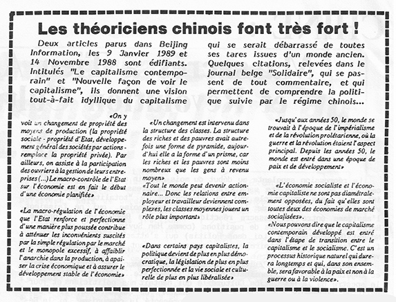 On le voit, il y a une certaine constance dans les positions développées par ce dirigeant. De la Révolution Culturelle aux massacres de Juin dernier, en passant par la défense de la Théorie des Trois Mondes, c’est bien une position réactionnaire, bourgeoise, et il est absolument faux de prétendre qu’il y a un changement de ses positions. Deng a agi en Juin comme Jaruzelski en Pologne en 1981, comme Brejnev en Afghanistan, bref comme n’importe quel dirigeant révisionniste qui voit son pouvoir remis en cause par les masses populaires.