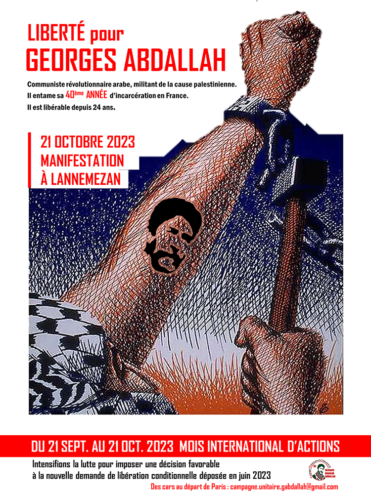 C’est en ce sens et en tenant compte de cette nouvelle phase que nous appelons cette année encore à un mois international d’actions pour la libération de Georges Abdallah. Il y a un an, depuis la prison, notre camarade lui-même l’affirmait : « Les diverses initiatives solidaires que vous avez développées dans cette campagne internationale depuis un mois apportent un cinglant démenti à ceux et à celles qui misaient sur l’essoufflement de votre mobilisation ». Faisons donc en sorte, cette année encore, du 21 septembre au 21 octobre 2023, - date de la 13e manifestation devant le centre pénitentiaire de Lannemezan et à l’aube de l’entrée dans la 40e année de détention de notre camarade - d’user de cette arme puissante qu’est la solidarité. Ainsi, chaque jour faisant mais notamment aussi dans ce temps coordonné du mois d’actions, que mille initiatives fleurissent partout en France et à l’international pour la libération de Georges Abdallah et par-là même pour soutenir son combat ! Que mille initiatives agissent pour accentuer ce rapport de force ! Que mille initiatives participent à arracher notre camarade des griffes de l’ennemi !