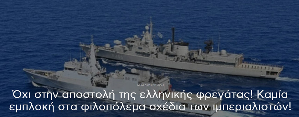Traduit du grec par nos soins. Texte original : https://www.kkeml.gr/oxi-stin-apostoli-tis-ellinikis-fregatas-kamia-emploki-sta-filopolema-sxedia-twn-imperialistwn/