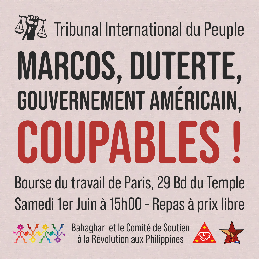 Samedi 1er Juin aura lieu le retour sur la session du Tribunal International du Peuple qui s’est tenu les 17 et 18 mai à Bruxelles, concernant la situation aux Philippines.
