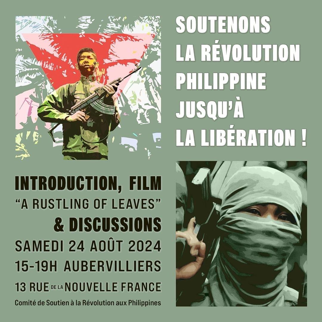 Le Comité de Soutien à la Révolution aux Philippines organise ce samedi 24 août à 15h une projection de film et discussion sur la lutte armée aux Philippines au Bathyscaphe à Aubervilliers (13 Rue de la Nouvelle France).